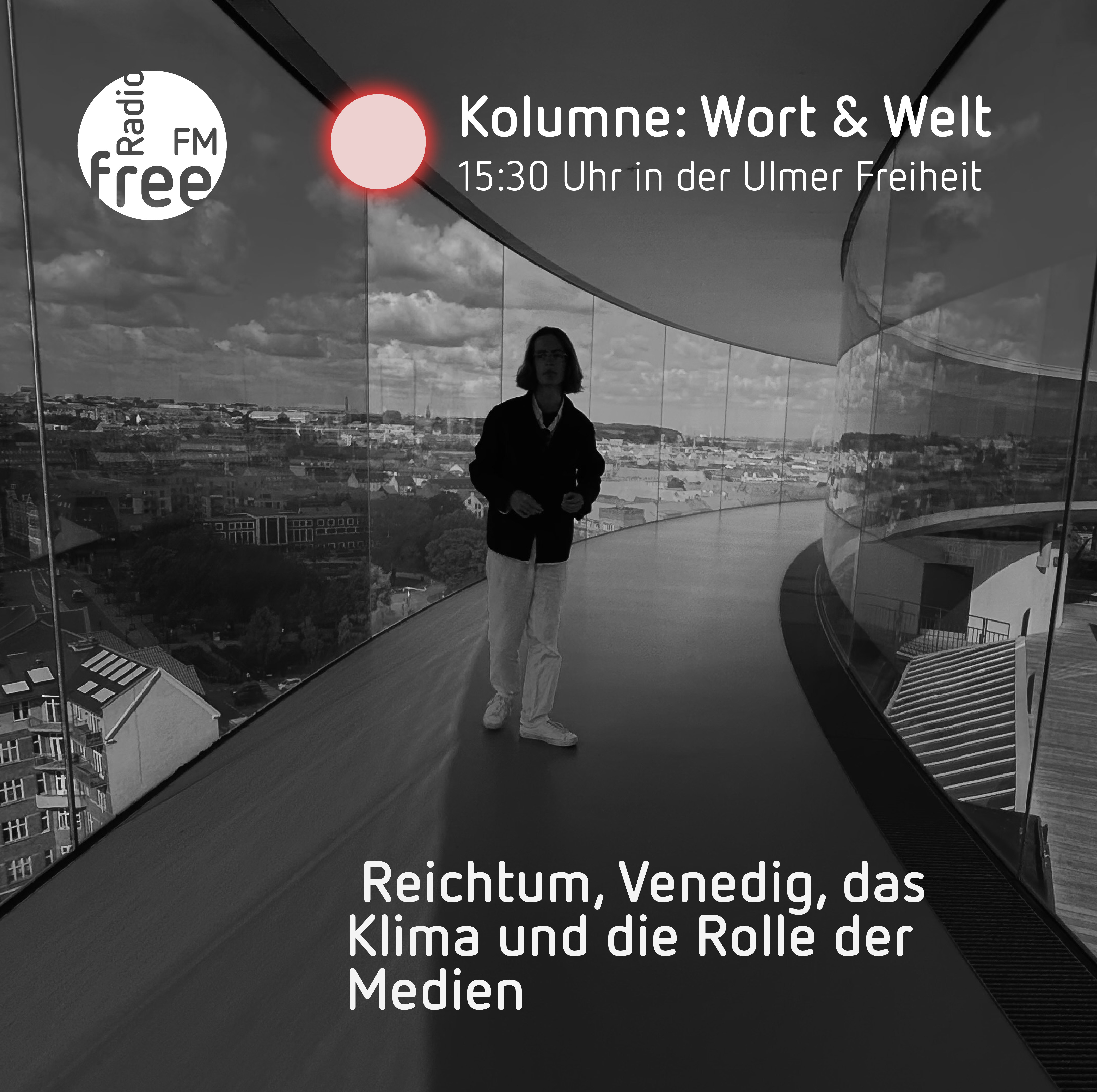 Heute um 15:30 Uhr in der Ulmer Freiheit gibt es die vierte Ausgabe der Kolumne "Wort & Welt" von Franz Kalmbach: Diesmal geht es um Reichtum, Venedig, das Klima und die Rolle der Medien. Was Supperreiche der Umwelt antun, warum wir und die Medien das dulden und was das für unseren Planeten bedeutet.