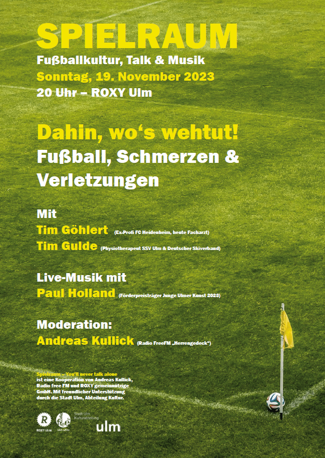 Ende des vergangenen Jahres fand im Ulmer Roxy wieder der Fußball-Talk SPIELRAUM statt. Zum Thema „Dahin, wo’s wehtut! – Fußball, Schmerzen und Verletzungen“ hatte ich mir mit Ex-Profi Tim Göhlert und Physio Tim Gulde zwei Gäste eingeladen, die sich mit Schmerzen im Fußball und im Sport bestens auskennen. Gemeinsam beleuchteten Tim & Tim Schmerzen im Sport aus allen Perspektiven. Den ersten Teil der Aufzeichnung „SPIELRAUM – Dahin, wo’s weh tut!“ gibt es heute Abend im Herrengedeck. Der zweite Teil folgt dann in 4 Wochen. |