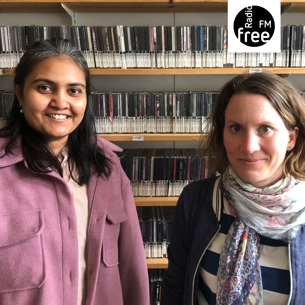 Rashmita Jadav und Leonie Müßig vor der Wand im Musikarchiv