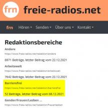 In unseren Online Treffen haben wir festgestellt, dass wir unsere Beiträge nur schwer auffinden. Das ist auch für einen Programmaustausch untereinander ein großes Hindernis. Deshalb haben wir die Macher von https://www.freie-radios.net gebeten, die Auffindbarkeit von Beiträgen und Sendungen mit Handicap zu verbessern indem sie einen eigenen Redaktionsbereich Barrierefrei einrichten. Sie haben das innerhalb von einer Woche sofort umgesetzt. Die Barrierefrei Audios finden sich jetzt hier https://www.freie-radios.net/redaktion/barrierefrei