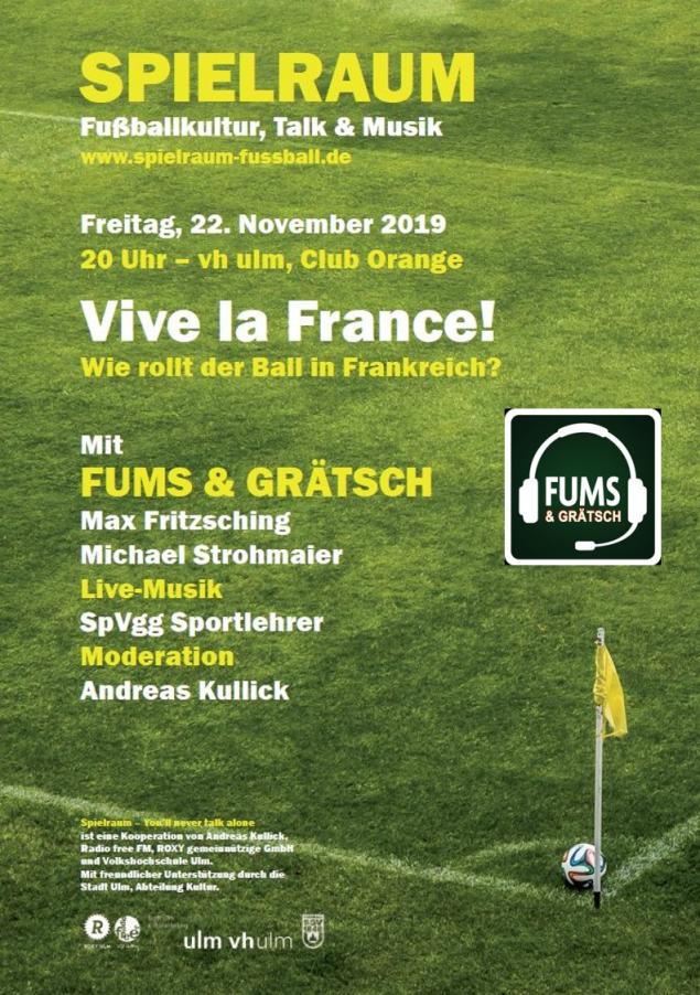 Heute abend um 20 Uhr findet in der vh Ulm "Spielraum - Fußball, Talk, Music" statt. Passend zum Themenschwerpunkt der VH geht es um Frankreich. Unter Vive la France wird der Französische Fußball erörtert. Die Moderation übernimmt natürlich Starmoderator von Tribünendach und Herrengedeck: Andreas Kullick. Als waschechter Manager hat er natürlich keine Kosten und Mühen gescheut, daher kann man sich unter anderem auf "Fums&Grätsch" freuen. Die beiden Podcaster Michael Strohmaier und Max Fritzsching sorgen bei Fußballfans am Montag für den richtigen Wochenstart und performen den beliebten Podcast heute Abend live.