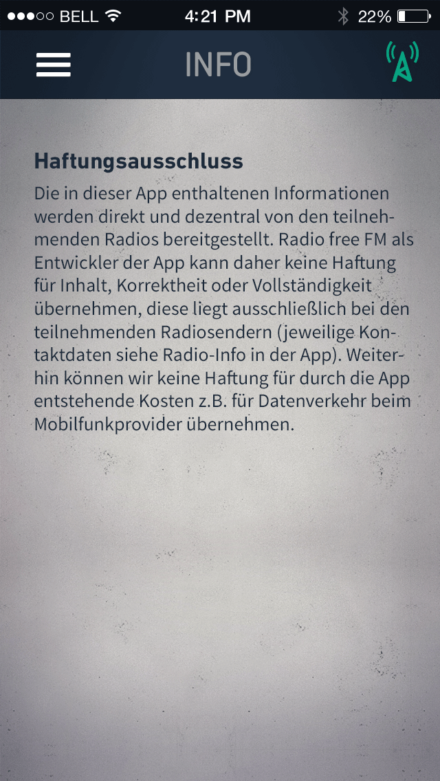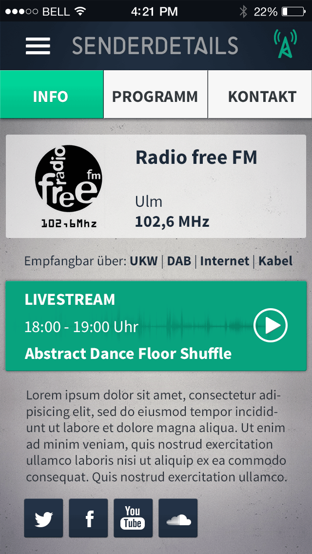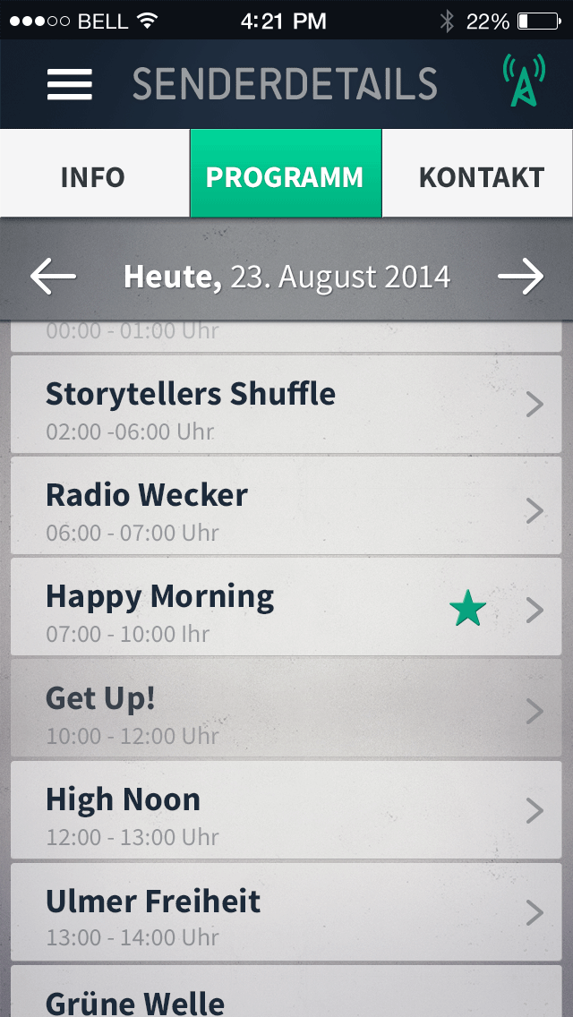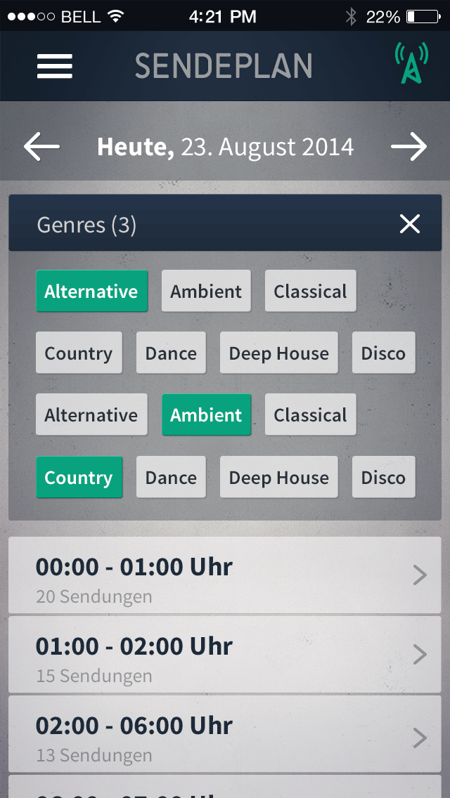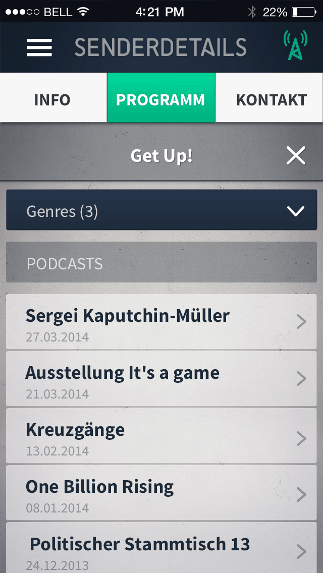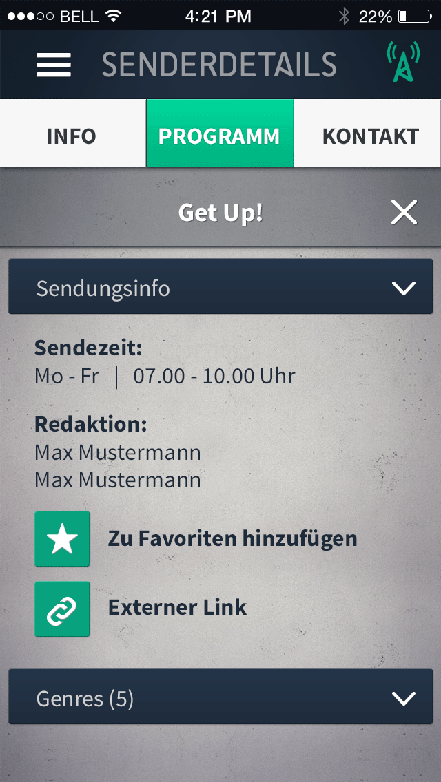 14.10.2014 | 21:00 — Anonymous 01.1 Map POI Cluster 01.2 Map POI normal 01.3 Map POI pressed 02.1 List white 02.2 List suche 03.1 Senderdetails Info 03.2 Senderdetails Programm 03.3 Senderdetails Programm (gescrollt) 03.4 Senderdetails Programm (pressed) 03.5 Sendungsdetails Part 01 03.5 Sendungsdetails Part 02 03.6 Senderdetails Kontakt 04.1 Menue 04.2 Menue pressed 05.0 Suche 06 Favoriten 07.1 Info 07.2 Info 07.3 Info 08 Ortung 09.1 Senderdetails Programm (Genrewahl geschlossen) 09.2 Senderdetails Programm (Genrewahl aufgeklappt) 09.3 Senderdetails Programm